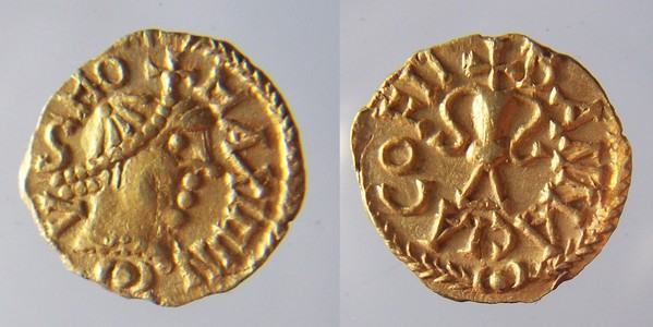 Triens de Banassac (Lozère) frappé vers 630 au nom de Maximus qui était monétaire sous Charibert II (629-632).