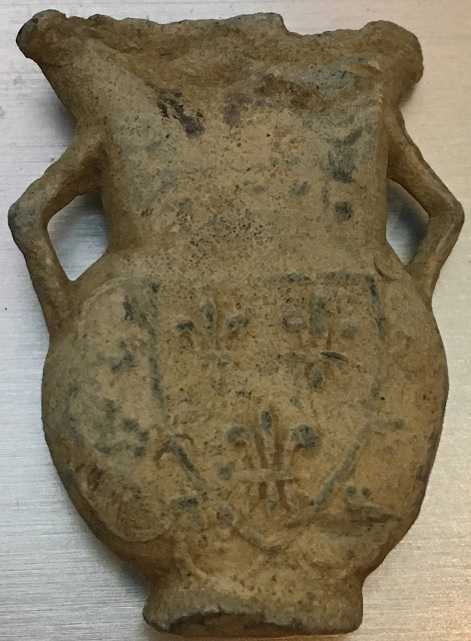 Ampoulette de pèlerin en forme de vase à panse coudée du fin XIV - XVI ème siècle.