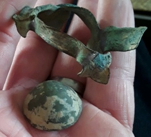A un mètre environ de cet objet, il y avait l'espèce de petit dôme creux et qui a les mêmes restes de dorures. Les deux sont peut-être liés.