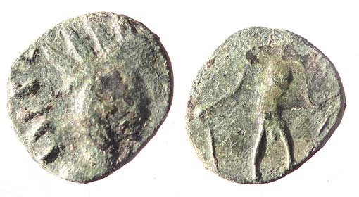 Bien jolie dans sa petite patine verte claire, elle montre un portrait à droite avec une couronne radiée . au revers, une silhouette d'extraterrestre , avec une lance à la main droite ou /et en les jambes ..on dirait bien..