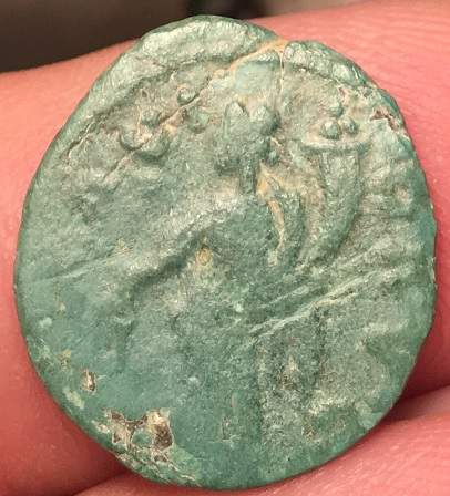 Trouvée dans un champs du 69, elle mesure 18mm pour 2.18g et est à mon avis en billon.