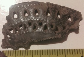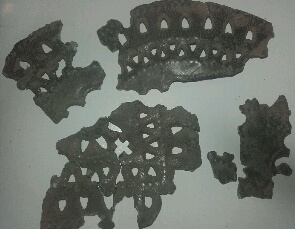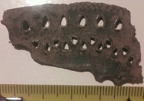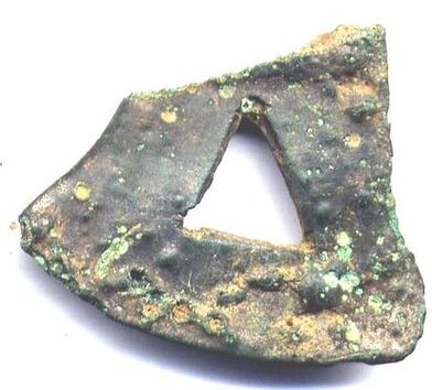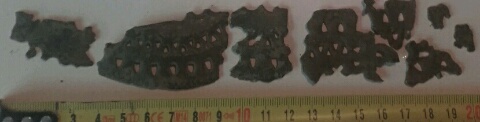 On peut voir un reste de rivet sur la deuxième photo, entre les deux trous en haut à droite et sur la face arrière en haut à gauche. Poids du morceau des deux dernières photos de 10.8g.