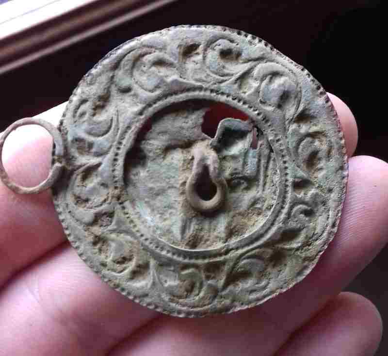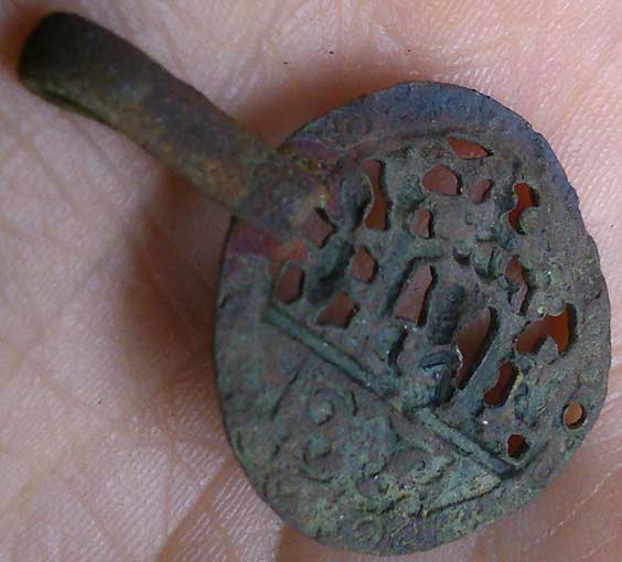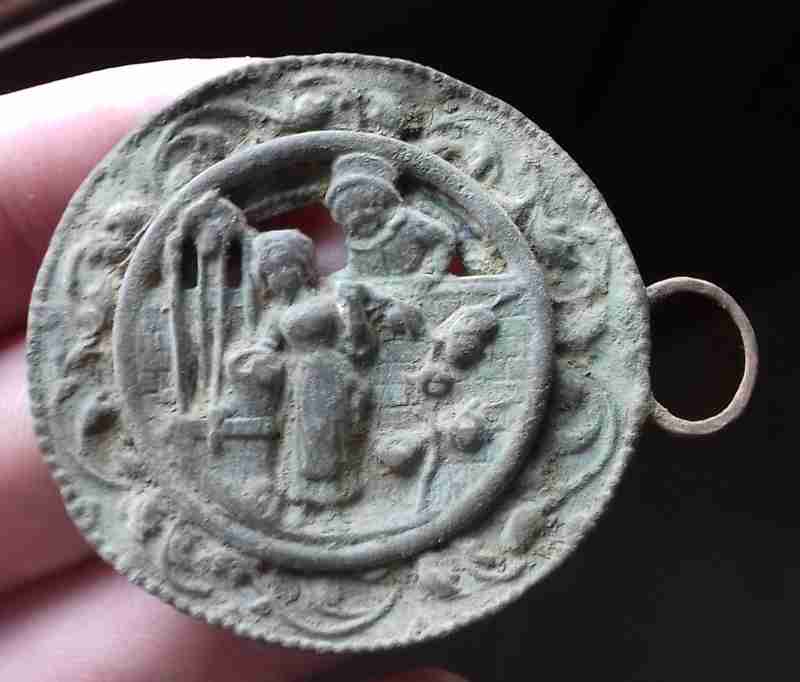 J'ai besoin de vous pour me confirmer ce que je pense être une applique vestimentaire de fin XIX début XXème siècle. L'applique présente une femme devant un puits, un arbre fruité à côté et un enfant regardant par dessus un mur. Elle mesure 4 cm de diamètre (sans compter l'attache) et pèse environ 9 gramme.