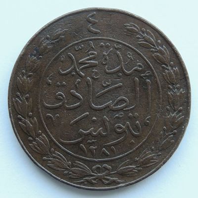 La seconde face dit : Muddha Mohamed es-sadiq bi Tounis , qui peut se traduire par ' sous Mohamed Sadiq à Tunis ' . On peut penser que Mohamed Sadiq était le Bey de Tunis lors de l'émission de cette pièce .