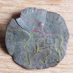 Pour ma part, voilà ce que je pense apercevoir d'un cavalier et sa monture. Il y a comme une forme humaine au dessus de ce que je pense être le bras, mais je ne sais pas si ce n'est pas simplement une pliure de la pièce.