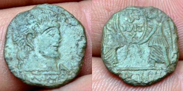 Voici une petite monnaie romaine en bronze d'environ 18 mm de diamètre qui me pose problème, étant donné le peu de titulature visible...