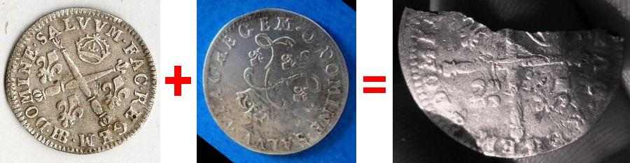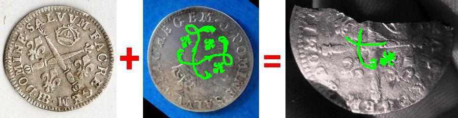 Sur le montage-photos ci-dessous, j'ai mis en vert les motifs de la ''quatre sols aux deux L'' que l'on distingue encore, dont la fameuse petite fleur de lys...