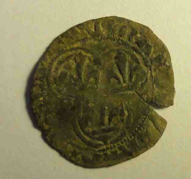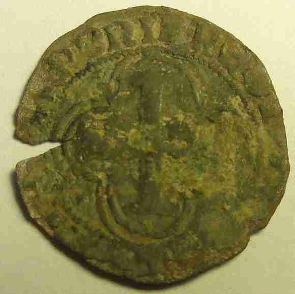 double trilobe avec trois f. de lys et croix cantonné dans un double quadrilobe légendes commençant par une nef ! visible à 12 heures sur les trois lys !!
