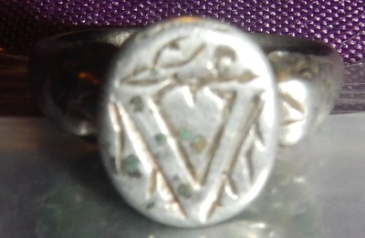 Il s'agit d'une bague en argent comportant un grand V et un cœur !