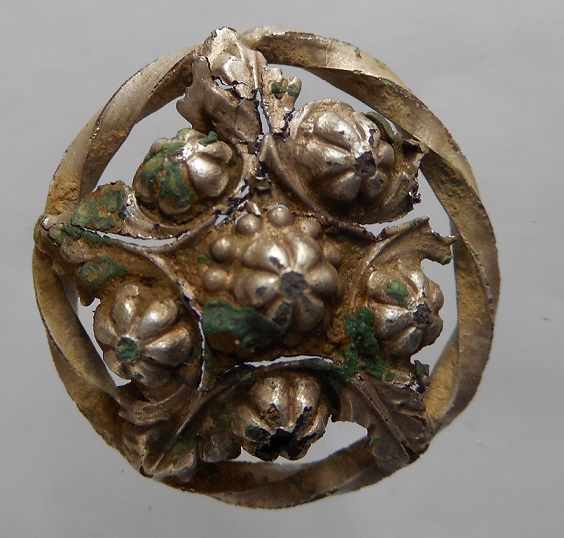 - Rond de 2,5 cm de diamètre. L'extérieur est formé d'un cercle en cuivre étamé. Aux angles on voit le cuivre où l'étamage a éclaté.