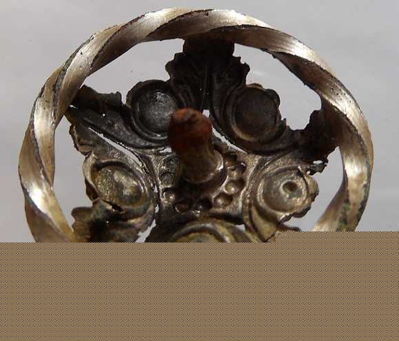 Au centre une tige de 8 mm de long, visiblement cassée et des traces de rouille à la cassure (l'aimant n'a aucun effet)