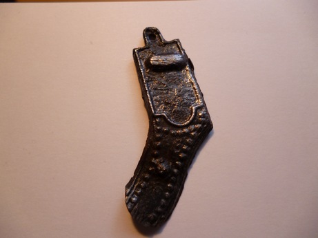 ressemblant sur le net. En étain je suppose, il présente une petite bélière et un rivet en son centre, donc j'écarterais déjà un pendentif style ' chaussette '.... ...! Légère fracture Ã