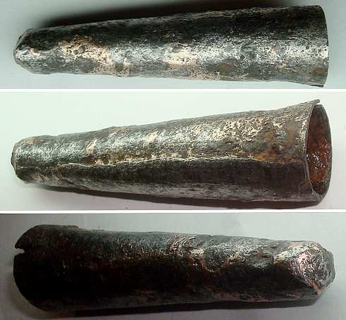 Tous fraîchement sorti de l'électrolyse aussi, cet objet forgé et 'soigneusement ' (un peu de bavures quand même !) soudé au cuivre au niveau de la jonction.