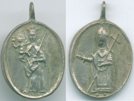 Avers : une sainte couronnée, portant un enfant sur le bras droit . Celui-ci ayant la tête ensoleillé . l'enfant semble porter une boule crucifère. dans son bras gauche une lance.