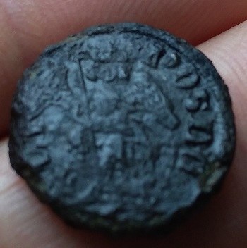 On aperçoit l’archange Saint Michel (ailes) couronné avec une lance (une croix en haute de la lance?) ; à ses pieds il me semble voir un écu… (L’autre face est lisse avec des traces de limes)