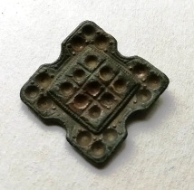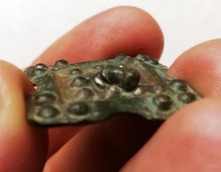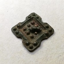 Voici un objet en bronze ou cuivre, 25 mm, embouti a l'avant et avec une petite tige tordu à l'arrière.