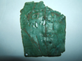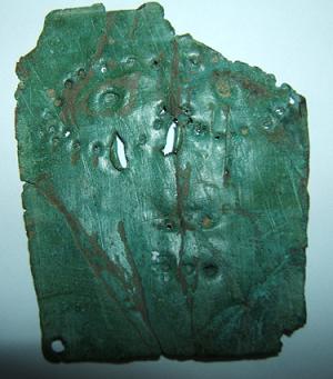 Justement ce n'est pas symétrique ..comme dit précédemment c'est de la tôle de cuivre très fine 5cm de haut .je n'ai pas de balance mais env 4 ou 5 grs . Les pliures à mon avis sont dues aux labours qui l'ont massacré.cette plaquette à été trouvée dans la vallée de la Vienne tourangelle.J'ai cru voir que des visages symbolisés étaient gravés ou martelés sur de petites tôles en guise d'offrande dans l'Antiquité mais je doute, je n'avais pas pensé à une chape de boucle.Je l'avais dans un tiroir depuis une vingtaine d'années et le mystère reste entier ! Et bonne année on vide les tiroirs!!