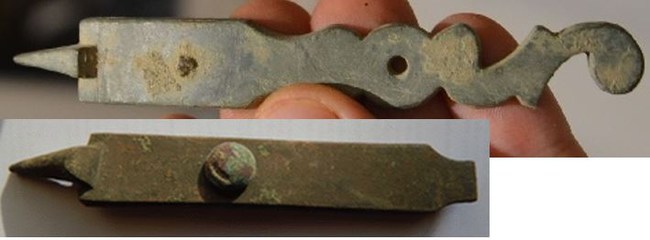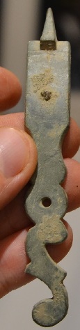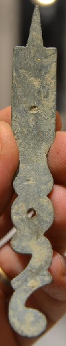 L'objet est courbé et présente deux petit trous dont un bonché par un truc en fer