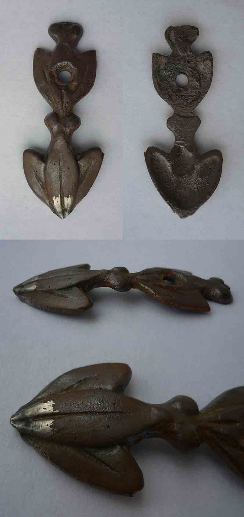 Objet d'un ami, il mesure 53mm et pèse 11 grammes. L'objet était riveté, Il est légèrement incurvé et étamé en pointe. Je pense à une déco mais de quoi ? Harnachement, pichet, etc. Ils nous semblent apercevoir 2 motifs identiques de par la forme, soit 2 colombes (st-esprit) ou grenouilles !