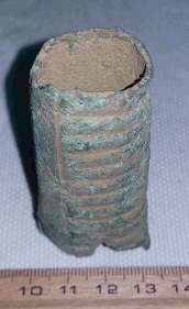 Sortie ce week-end dans un champ de mon secteur, maintes fois fait, petites trouvailles dont une assez originale pour un tube (pas lisse) mais a la surface cannelée, parmi plusieurs objets ..., probablement en bronze avec une patine bien verte ...