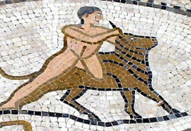 Pourrait être la reprèsentation d'Hercule qui combat le taureau de Crète. Voir la mosaique de Meknes au Maroc.