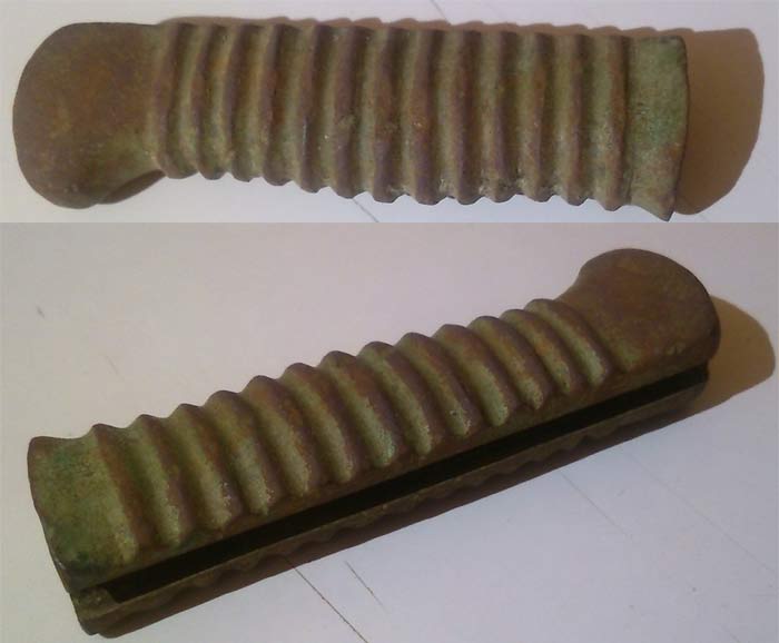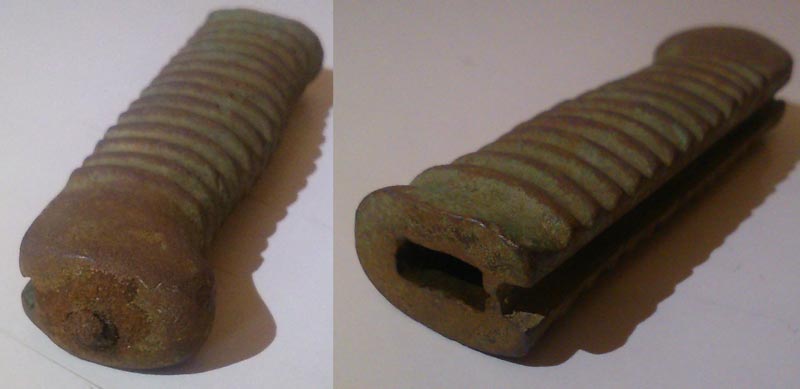 Voici un petit manche en bronze. ( 7 cm de long) J'y connais rien dans ce domaine, la rainure me fait penser a un morceau de poignee de baïonnette, mais la taille est vraiment petite non?