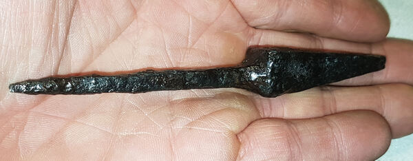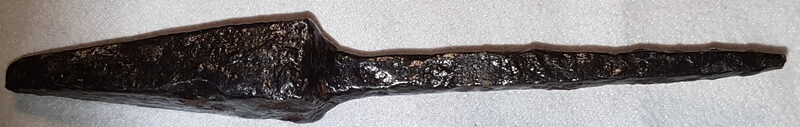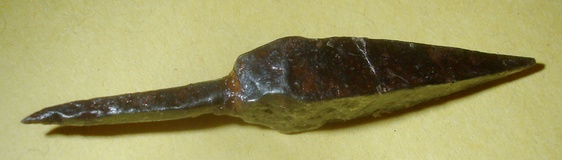 je me suis peut-être enflammé, car la soie s'affine à l'arrière ....il pourrait bien s'agir d'une pointe de flèche à pédoncule.....age du fer.........vas sur artefacts et cherche: Pointe de flèche à soie et tête pyramidale,il y a quelques modèles.