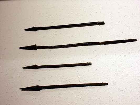 - Le pointeau : Longueur du fer : 14 cm, section pyramidale de 0 à 10 mm, emmanché sur un fût de 17 mm de diamètre, terminé par un empennage de cuir. Son efficacité n'est pas seulement due à la redoutable puissance des arbalètes de guerre du XIVème mais aussi à son fût exagérément lourd. Son impact, dans un premier temps, perce l'armure puis ses quatre angles tranchent le métal. Au moment où la friction freine le fer, l'inertie accumulée par le fût est restituée, et telle une masse, enfonce davantage le fer.........................