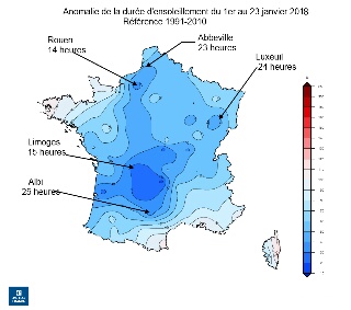 Ci joint la carte Météo France sur l'ensoleillement de ce mois de janvier. Le titre m'a bien fait marré ' Anomalie de la durée d'ensoleillement...'
