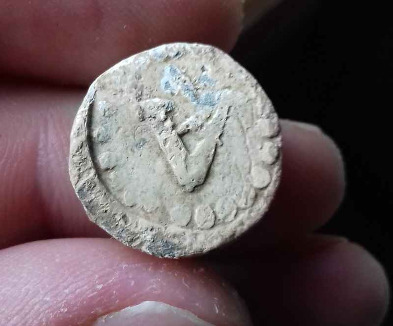 D'un côté on peut y lire un V et de l'autre une sorte de flèche. Il pèse 10g et mesure 1.5cm de diamètre.