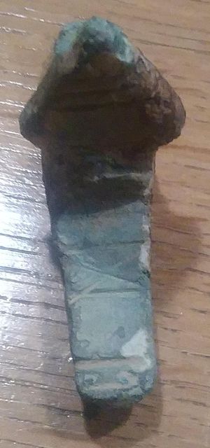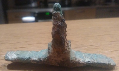 Il mesure 4 cm de long et est visiblement en bronze. Ce qui le fait sortir du lot, ce sont les petite gravures qui le décorent. Merci d'avance à ceux qui s'y interesseront!