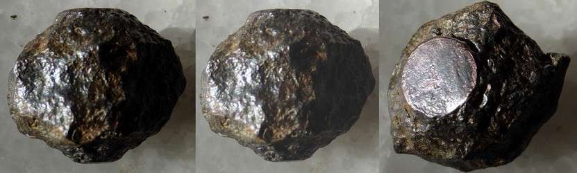 par contre ce qui m'interpelle cette bille est traversée par une pointe en cuivre s'un diamètre de 8,5 mm d'un côté et de 5 mm de l'autre ,sans trace visible de fracture.