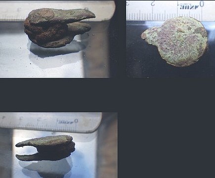 Sorti de la bam, ce truc en bronze avec une rondelle de cuir en son centre,m'intrigue....un tenon(fer?) fait office de rivet ,l'objet semble cassé aux pointes comme usé... ....