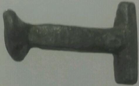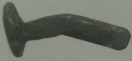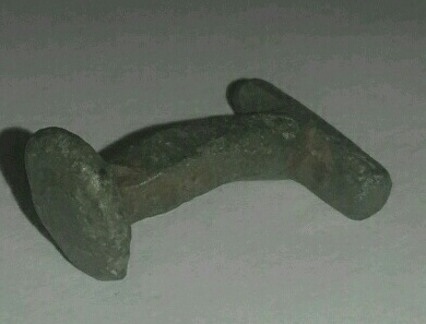 Morceau de bronze en forme de bouton de manchette mesurant 2cm par 1.5cm. Je ne vois pas de cassure apparente et je pense que la courbure est d'origine, la tête et grossièrement ovale.