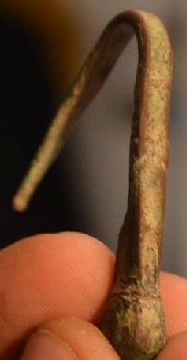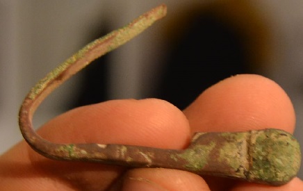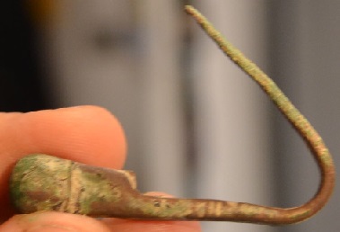 Voici une aiguille ou une épingle en cuivre qui me semble un peu décorée (je parle des petits traits, c'est discret)