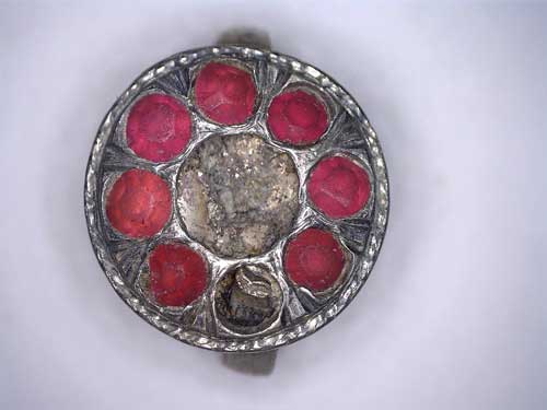 elle est en argent pèse 8 gr et fait 1.8 de diamètre. je ne sais pas se que c'est comme pierres grenat saphir etc....