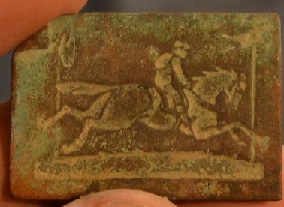 Voici une plaque en cuivre de 3.2cm / 2.3cm représentant un cavalier au galop.