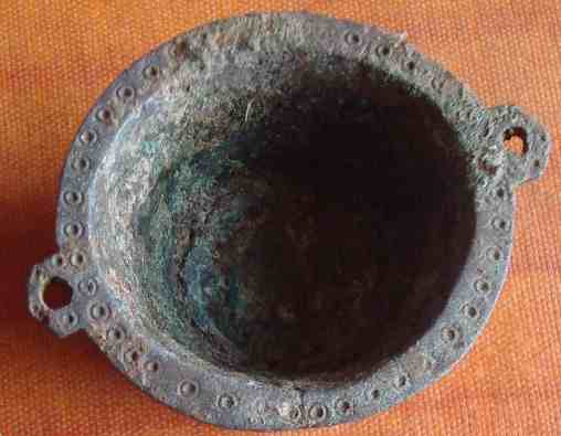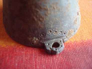 [1429] Bien vue comme piste ! mais non il n'y a aucunes traces d'usure qui correspondraient à un anneau de chaînette au niveau et sous les anses ! juste un petit défaut de coulure sur l'anse que l'on aperçoit !