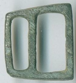 Bonjour, merci pour me dater cette petite boucle à double fenêtres assymétrique en bronze de dimensions 16mm X 10mm. De forme trapézoïdale, assez grossière et présentant qq traces de coups de limes.