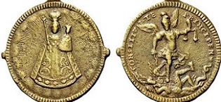 Il s'agit sur une face de St Michel tenant une épée, Son symbole = L'épée tranche, en séparant le bien du mal