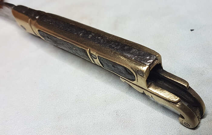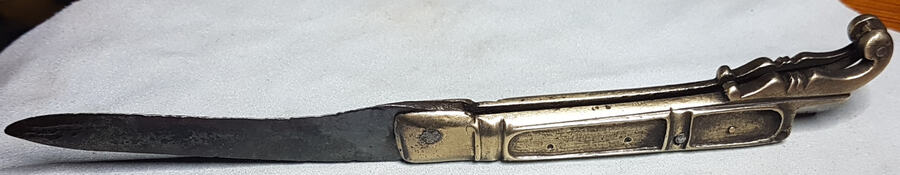 Je ne pense pas que ce soit ce type de couteau . Je pense qu'il manque effectivement une partie qui vient recouvrir le début du manche . cette partie devait pivoter autour du rivet en bas de la volute .