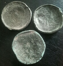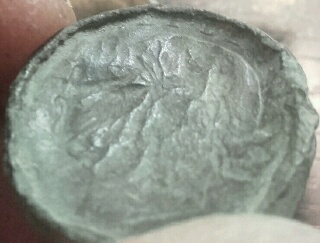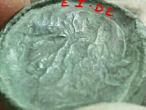 Si tu ne vois rien, je te rassure c'est normal, il n'y a rien à voir après le martelage. La seule chose que je distingue c'est un profil regardant à gauche sur deux des monnaies ainsi que les 4 lettres citées.