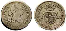 En 1771, Charles III a donné l’ordre secret de retirer les monnaies existantes pour les fondre et frapper des pièces avec les mêmes poids, évidemment, mais avec moins de métal précieux – 81,250% pour la monnaie provinciale et 90,277% pour la monnaie nationale. Pour distinguer ces nouvelles pièces, on a dessiné une forme tout à fait neuve de l écu pour le blason espagnol simplifié de quatre quartiers (1er et 4ème un château pour Castille, 2ème et 3ème un lion pour Leon et une grenade dans l’enté en point pour Granada). Ce nouvel écu qui date de 1772 ne s’utilisait qu’en Espagne, sauf quelques rares exceptions, et, au début, seulement pour les monnaies d’argent, tandis que les maisons de la monnaie coloniales continuaient à utiliser l’ancien.