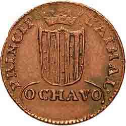 Si la monnaie de l’ami Iasus est de cuivre, l’unique possibilité reste l’Ochavo. Il est vrai que pendant le règne de Charles IV, les catalans frappaient des pièces de 2, 3 et 6 cuartos avec le blason simplifié, mais on peut les laisser à côté à cause de leur diamètres (23mm, 26mm et 31mm) et poids, beaucoup plus élevés.