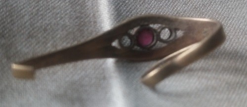 Comme on ne voit pas bien sur la photo, s'agit-il d'une pierre (un grenat?) ou de verroterie? Il devait y avoir deux autres pierres ou pâtes de verre (une de chaque côté), et s'il s'agit bien d'une pierre au milieu, pourquoi pas deux tout petits diamants? En tous cas, j'y vois une bague de fiançailles, fin XIX ème, tout début XXème.
