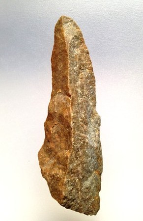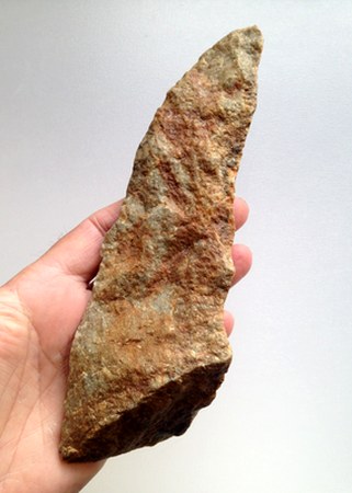 Franchement désolé, mais pour moi, rien d'anthropique dans cette pierre. La forme est une chose, l'outil proprement dit une autre. En R9, absence de bulbe de percussion. Dans le paléolithique breton, il n'y a aucun outil similaire. Seule la forme laisse à penser que .... On retrouve effectivement de l'outillage en grès ou en quartzite paléo en Bretagne mais toujours des outils travaillés avec des retouches. Pourquoi un si grand 'outil' qui serait une lame, ne présente t-il aucune retouche ? Je te conseille de montrer tes trouvailles à un archéologue ou à un 'expert' mais c'est à mon sens purement l'oeuvre de dame nature.