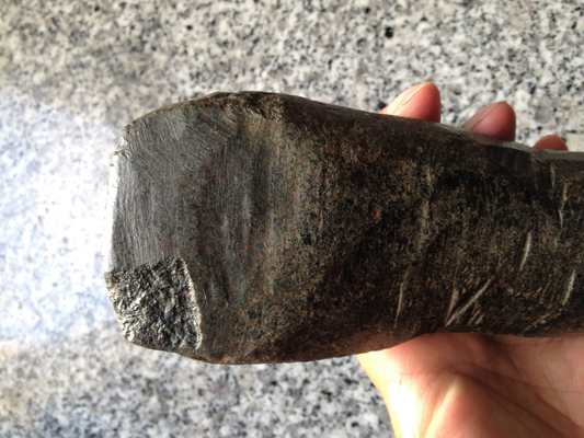 Quant à moi, la pièce suivante a attiré mon attention . Il s'agit d'une grande hache de pierre qui m'a semblée atypique . Ce n'est ni une hache de pierre polie classique, ni une hache de pierre taillée .