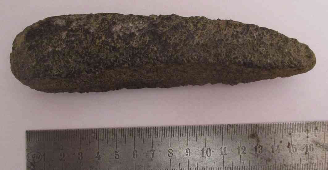 je vous poste cette demande d'identification pour cette pierre trouvée dans un labour de la Beauce il y a déjà quelque temps. Certains de mes collègues diplômés en géologie m'affirment que cette pierre est très dense (271 grammes pour 15,6 cm de long et 3.5 cm de large avec une extrémité évasée et l'autre en pointe), qu'elle semble être du basalte qui ne procéderait pas facilement de France. Auriez vous une idée de quelle sorte d'outil elle peut être? De quelle époque serait donc cet outil? Et si elle ne procède pas de France, d'où viendrait elle?