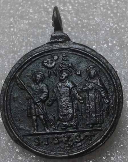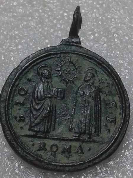 Voilà donc la jolie trouvaille du frangin ! Je vois l'enfant Jésus dans le Ciel avec une flèche dirigée sur la vierge Marie ( ?) et deux personnages à identifier. L'autre côté est aussi mystérieux et les acronymes me sont étrangers.