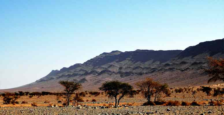 Je fais suivre 2 photos du Jebel Bani, où il a été trouvé ( mais pas au même endroit cependant ) . Cette montagne , de 1100 à 1400 mètres d'altitude est fascinante car elle constitue une barrière qui n'est franchissable qu'à travers des cluses parfois séparées de plusieurs dizaine de kms . Au sud, le désert, et le fleuve Draa à quelques kms . On imagine sans peine que les ' Homos ' de toutes époques se postaient en hauteur pour dominer la savane .
